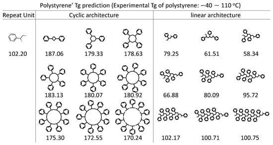 RNN model predictions on various polystyrene architectures. The cyclic architecture and linear architecture of polystyrene being evaluated by the obtained RNN model are accompanied by the prediction (in Celsius). Experimental is taken from [89], with values ranging from −40∼100 °C and 65∼110 °C form linear and cyclic polystyrene polymers, respectively, depending on the molecular weight.
