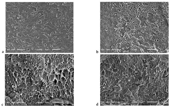 SEM images of cryofracture surfaces of PLA/PBAT/CNFs blends (a,b) and in situ generated composites (c,d). (a,c)—3wt.%CNFs, (b,d)—7wt.%CNFs.