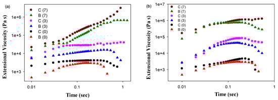 Time-dependence of tensile stress growth coefficient (t,) for molten PLA/PBAT as well as PLA/PBAT/CNFs blends and in situ generated composites. The shear tests were performed at temperatures 70 °C (a) and 120 °C (b). Curves were shifted vertically for better visualization. C and B stand for the composite and blend, respectively. The numbers in parentheses indicate the concentration of CNFs.