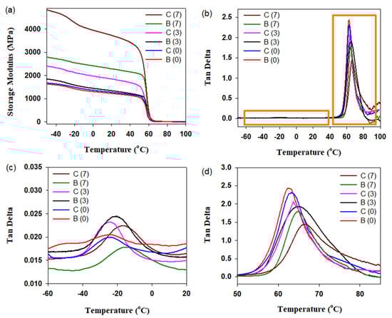 Storage modulus (a) and tan δ (b–d) of PLA/PBAT as well as PLA/PBAT/CNFs blends and in situ generated composites in a tensile mode. C and B stand for the composite and blend, respectively. The numbers in parentheses indicate the concentration of CNFs.