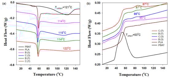 Heating endotherms (a) and cooling exotherms (b) of PLA and PBAT as well as PLA/PBAT/CNFs blends and in situ generated composites. C and B stand for the composite and blend, respectively. The numbers in parentheses indicate the concentration of CNFs.