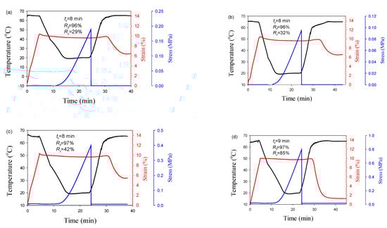 Temperature and strain of PLA/PBAT/CNFs blends (a,b) and in situ generated composites (c,d) during dual shape memory cycle. Td = 65 °C. (a,c)–3%, (b,d)–7 wt.%CNTs.