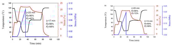 Temperature and strain of PLA/PBAT/CNFs blends (a) and in situ generated composites (b) during triple shape memory cycle. Td = 65 °C, 120 °C. CNFs—7 wt.%.