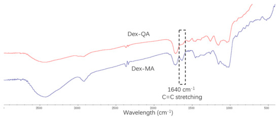 We used a simple esterification method to introduce methacrylate (MA) to dextran, in which triethylamine was used as the base catalyst and methyl acrylate anhydride as the esterification reagent [32], in either DMSO or water. Chemical structures and DS values of the Dex-MA and HPC-MA samples could be determined by 1H NMR (Figure S3). As shown in Figure 1, resonances from the methacrylate motif appeared clearly at 6.24 ppm (a) and 5.78 ppm (b), and the peak at 1.97 ppm was assigned to the methyl (c), well separated from the dextran backbone; all were consistent with the proposed structure. To demonstrate that Dex-MA has a tunable DS(MA), dextran was reacted with different equivalents of methacrylate anhydride under different conditions. The DS(MA) was calculated based on the integrals of isolated olefin resonances with that of the dextran anomeric H (1). Table 1 displays that Dex-MA with a different DS(MA) can be prepared. We discovered that Dex-MA with high DS(MA) could be only obtained at a high reaction temperature (70 °C) with DMSO as solvent. Using water as solvent afforded water-soluble Dex-MA with relatively small DS(MA). Note that a DS(MA) below 0.4 was necessary to preserve the water-solubility of Dex-MA. The proposed Dex-MA chemical structure is also supported by FT-IR. As shown in Figure 2, a distinctive absorbance at 1640 cm−1 was observed and assigned as an acrylate C=O stretch.