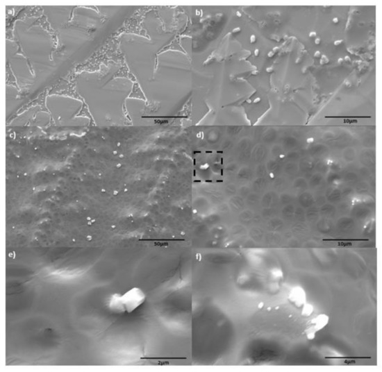 SEM images of HPC-QA/E. coli PBS sample (c–f) and E. coli PBS sample (a,b). (e) is the enlarged region labeled in (d).