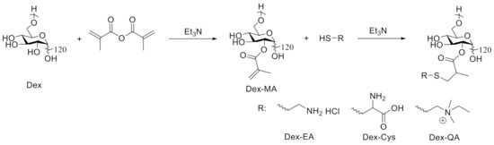 2.5. Procedure for Thiol-Michael Addition of Dex-MA and HPC-MA with 2-Thioethyl Amine (EA), Cysteine (Cys), and N-ethyl-N,N-dimethy-2-thioethyl Aminium Iodide (QA-SH)