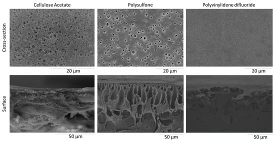 When considering the pore size and distribution of the three membrane samples evaluated in this study, the significantly high permeability shown by the CA membrane can be ascribed by their low surface water contact angle (Figure 5) combined with the higher surface pore population. Some membranes can show a similar pore size and distribution but differ in pore number, as detailed in an earlier report [43]. When evaluating the surface SEM image in Figure 2, it can be seen that the CA membrane’s surface pores are highly populated compared to the rest.