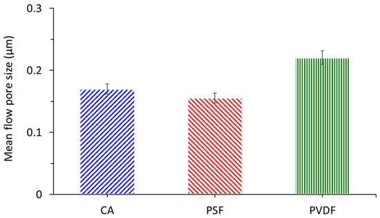 Figure 4 depicts the mean pore size distribution of CA, PSF, and plain PVDF analyzed with CFP. The CFP test accurately captures the pore size across the thickness and the size distribution shown in Figure 3. It shows that the plain PVDF membrane exhibits the largest mean flow pore size of 0.2206 µm in comparison to CA and PSF, with a mean flow pore size of 0.17 and 0.1556 µm, respectively. The SEM images of the plain PVDF membrane show poor surface pore visibility. Figure 4 shows that the pore size of the membranes is comparable and all are expected to effectively retain oil droplets in the oil/water emulsion feeds. In addition to the mean flow pore size and pore size distribution, the specific number of pore per unit of membrane surface is also important to govern the permeability and can distinguish the throughput of membranes despite having a similar pore size and distribution.
