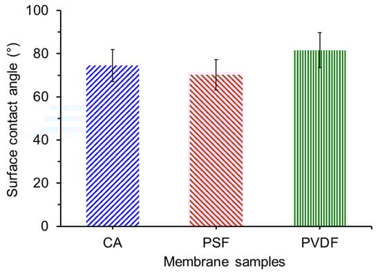Figure 5 shows the static water contact angle for the three membrane samples used in this study. The static water contact angle is essential in determining the permeability and fouling properties of a membrane. A membrane is considered hydrophilic when the contact angle falls between 0 to 90°. Membranes with hydrophilic properties are ideal in the oil/water emulsion treatment when water is the component that is permeating through the membrane pore and vice versa [34,35]. The hydrophilic surface attracts water by creating a hydration layer and prevents oil droplet interaction with the membrane surface, hence improving oil droplet rejection [36]. As shown in Figure 5, the PVDF membrane demonstrates the most hydrophobic characteristic with a water contact angle of 81.59°, attributed to the low polymer surface free energy [37]. This is followed by CA and PSF membranes with the surface water contact angles of 74.5 and 70.23°, respectively. The surface water contact angle of plain CA membrane from commercial polymers in this study is within the range reported earlier of 50–60° [38,39,40], which can be attributed to the variation surface structure and fabrication parameters and possibly due to the presence of impurities that can be further investigated as the follow-up study. These findings are encouraging and show that a CA membrane based from cigarette butt waste potentially possess a high clean water permeability and good anti-fouling property, at least when compared with the PVDF and PSF membranes samples used as a reference in this study.