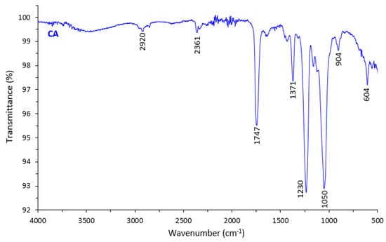 The FT-IR spectra in Figure 6 depicts the chemical composition of the prepared cigarette butt-based CA membrane. The FT-IR spectrum of CA shows a peak absorption band at 1747, 1230, and 1050 cm−1 which is assigned to the C=O carbonyl stretching, C–O stretching, and CO–O–CO stretching. The peaks at 1371 and 2920 cm−1 are attributed to the C–O group and aliphatic group (C–H), respectively. Additionally, the broad peak at around 3500 cm−1 represents the O–H group. Similar findings were reported by Liu et al. that attributed the presence of carbonyl stretching, symmetric, and asymmetric stretching vibrations of C–O–C, respectively, in the nanofiber membrane from waste cigarette butt [18].