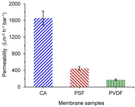 Figure 7 shows that the CA membrane outperforms the rest in filtration performance by having the highest permeability compared to PSF and PVDF membranes. Clean water permeability involves the passage of water molecules through the membrane under crossflow filtration. The CA membrane showed that the water permeability of 1658 L m−2 h−1 bar−1 is significantly higher than the PSF and PVDF membranes clean water permeability of 446 and 175 L m−2 h−1 bar−1, respectively.