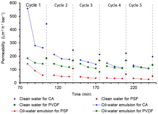 The permeability of the cellulose acetate (CA), polysulfone (PSF), and polyvinylidene difluoride (PVDF) membranes for five cycles in 30 min of oil/water emulsion and 5 min in clean water as a function of filtration time.