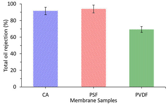 The oil rejection of PW filtration using the cellulose acetate (CA), polysulfone (PSF), and polyvinylidene difluoride (PVDF) membranes.