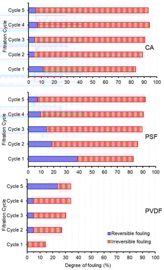 Figure 10 shows the analysis of membrane fouling based on its reversibility for CA compared to the PSF and the PVDF membranes. As expected, the total fouling for all three types of membranes showed an increasing trend with the increasing filtration cycles. The trend of multiple cycle performance is consistent with our earlier report treating the same feed following similar filtration cycles [10,11,12,47]. The three membranes pose quite distinct fouling reversibility. The total fouling depicted by PVDF at each cycle is relatively lower than the PSF and the CA membranes, indicating a lower degree of permeability loss and better antifouling properties. However, when judging from the actual permeability data in Figure 8, the performance of the PVDF membrane is comparable with the CA membrane. The low degree of fouling in the PVDF membrane compared to others is due to its relatively low clean water permeability compared to others (Figure 7). Therefore, the fouling parameters become low since the oil/water emulsion permeability was compared to the initial clean water permeability (Equations (3)–(5)). On the contrary, both CA and PSF demonstrated high total fouling since they pose high clean water permeability accompanied by similar oil/water emulsion permeability.