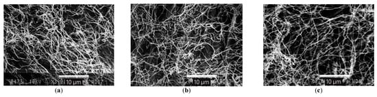 The surface morphology of BNC fibers was studied by scanning electron microscopy (SEM) on a JSM-840 scanning electron microscope (JEOL Ltd., Tokyo, Japan) after sputtering a Pt layer 1–5 nm thick. The BNC sample having dimensions of 5 cm × 5 cm was preliminarily held in aqueous ethanol solutions at different concentrations of 25%, 50%, 75% and 90% for 30 min in four steps for partial dehydration of the BNC sample; afterwards, the BNC sample was freeze-dried in an HR7000-M lyophilizer (Harvest Right, LLC, Salt Lake City, UT, USA).