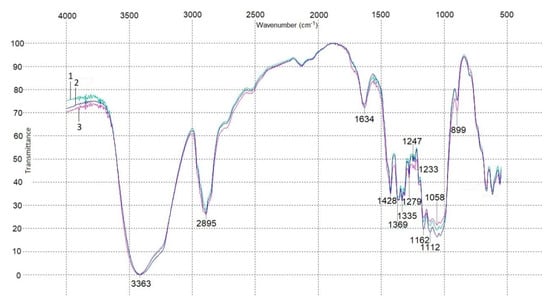 Figure 5 depicts an infrared spectrogram of the BNC sheets. The obtained IR spectra of all the three BNC sheets were almost identical and demonstrated a pattern typical of cellulose: absorption bands at 3363 cm−1 were attributed to stretch vibrations of OH groups and absorption bands at 2895 cm−1 were due to stretch vibrations of CH2 and CH groups. Absorptions bands at 1634 cm−1 were for bending vibrations of OH groups of strongly bound water. Absorption bands near 1430–1370 cm−1 suggested bending vibrations of CH2 and CH groups. Absorption bands near 1340–1320 cm−1 indicated bending vibrations of the primary OH alcohol group, those near 1290–1240 cm−1 stood for bending vibrations of CH2 alcohol group, and those near 1160–1040 cm−1 referred to stretch vibrations of C–O–C and C–O alcohol groups. Absorption bands at 899 cm−1 corroborated the presence of β-1,4 glycosidic bonds of glucose [44,45].