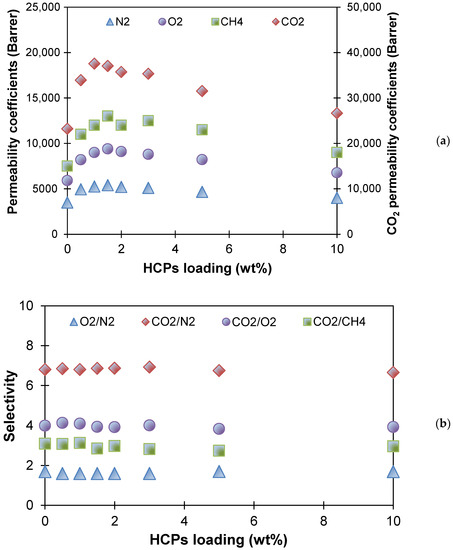 - Hou, R.; O’Loughlin, R.; Ackroyd, J.; Liu, Q.; Doherty, C.M.; Wang, H.; Hill, M.R.; Smith, S.J. Greatly Enhanced Gas Selectivity in Mixed-Matrix Membranes through Size-Controlled Hyper-Cross-Linked Polymer Additives. Ind. Eng. Chem. Res. 2020, 59, 13773–13782. [Google Scholar] [CrossRef]