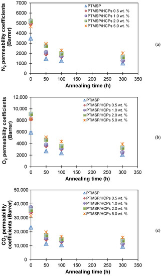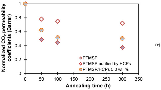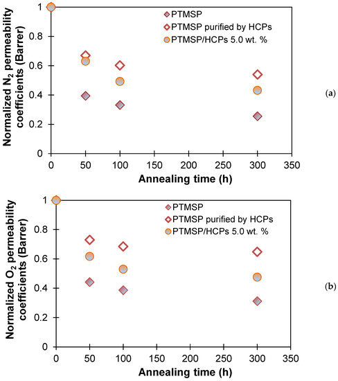 - Volkov, A.V.; Bakhtin, D.S.; Kulikov, L.A.; Terenina, M.V.; Golubev, G.S.; Bondarenko, G.N.; Legkov, S.A.; Shandryuk, G.A.; Volkov, V.V.; Khotimskiy, V.S. Stabilization of Gas Transport Properties of PTMSP with Porous Aromatic Framework: Effect of Annealing. J. Membr. Sci. 2016, 517, 80–90. [Google Scholar] [CrossRef]