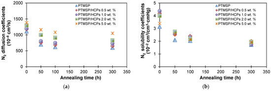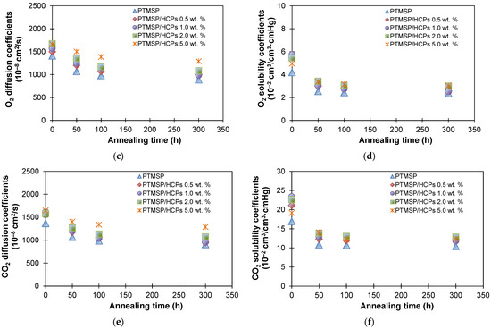| PTMSP/HCPS 0.5 wt % | 73 | 68 | 65 | 1.7 | 2.0 | 6.8 | 9.1 | 4.1 | 4.5 |