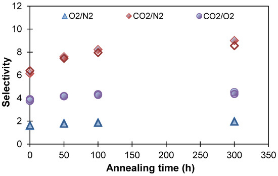 | Membranes | Decrease in Gas Permeability Coefficient, % | Selectivity | |||||||