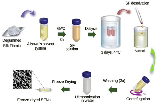 The silk fibroin nanoparticles were prepared by rapid desolvation of the freshly prepared silk fibroin aqueous solution in absolute ethanol, following the procedure described previously by Lozano-Pérez et al. [34]. In brief, degummed silk fibroin [35] was dissolved in Ajisawa’s solvent system at 65 °C for 3 h [36], filtered, and dialyzed for 48 h against distilled water with several changes in order to remove salts and alcohol. Then, the aqueous silk fibroin solution was dripped on ethanol under gentle stirring, resulting in the formation of the nanoparticles by rapid desolvation. The resultant suspension was stirred for 2 h, until the nanoparticles were stabilized, and then were recovered by centrifugation at 12,000× g for 15 min and 8 °C in an Eppendorf 5810R centrifuge (Eppendorf AG, Hamburg, Germany) equipped with an F-34-6-38 rotor, repeatedly washed (3×) with ultrapure water (18 MΩ·cm, from a Purelab Flex 2 ultrapure water Type I system, ELGA, High Wycombe, UK), and finally dispersed in ultrapure water by using high-power ultrasounds for 1 min at 10% of amplitude in a Branson SFX 550 Digital Sonifier equipped with a 1/8″ tapered microtip (Branson Ultrasonics Corp, Ridge Road Brookfield, CT, USA) (Figure S2). The resulting dispersion was then freeze-dried at −55 °C and 0.05 mbar for 72 h in a Christ Alpha 1-2 LDplus freeze-dryer (Martin Christ Gefriertrocknungsanlagen GmbH, Osterode am Harz, Germany) to obtain the SFNs as a white powder. A scheme of the process can be seen in Figure 2.