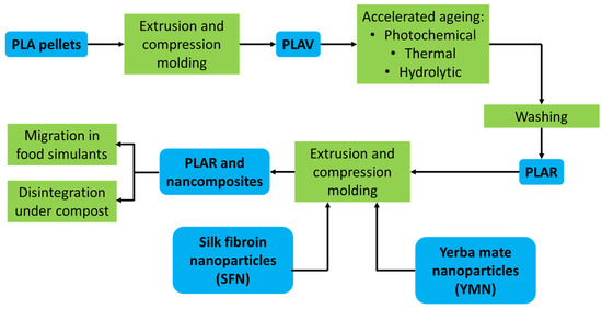 It is worth noting that the addition of organic fillers coming from renewable resources could be an interesting method for the improvement of the properties of PLA due to the renewable origin, availability, low cost, and biodegradability of such fillers. Nanoparticles extracted from renewable resources (e.g., crops, arthropods) as well as those coming from agro-food wastes are of particular interest for sustainable materials within the frame of a circular economy approach. In this context, PLA has been widely blended with lignocellulosic nanoparticles as well as protein-based nanoparticles. For instance, the incorporation of lignocellulosic nanoparticles extracted from waste of yerba mate (Ilex paraguariensis), a commonly consumed infusion in South America, into a PLA matrix has proven to be an effective way to increase the crystallization rate of PLA, leading to an improvement in the mechanical performance of the final nanocomposites [26]. Yerba mate is rich in methylxanthines (caffeine and theobromine), but the well-known properties of yerba mate are attributed to its rich composition in bioactive substances such as phenolic compounds (e.g., lignin, caffeic acid, and chlorogenic acid), flavonoids (e.g., catechin, quercetin, rutin, and kaempferol), saponins, tannins, and some vitamins (e.g., C, B1, and B2) [27,28]. The use of yerba mate waste for the extraction of lignocellulosic nanoreinforcements with antioxidant activity has been shown to be an effective way to revalorize such waste and improve the thermal stability of PLA [26]. Interestingly, silk fibroin (SF), a natural biopolymer, also showed the ability to promote the crystallization of PLA-based materials, improving the mechanical and barrier performance of the final nanocomposites [29]. Silk fibroin is a fibrous protein obtained from Bombyx mori cocoons and has been used by the textile industry for more than 8500 years [30] due to its excellent physical properties, such as light weight, high mechanical strength, flexibility, and luster. Over the last few decades, a wide range of new applications have been developed based on its biocompatibility, biodegradability, and non-immunogenicity, becoming an outstanding candidate for biomedical uses [31]. Additionally, in previous works the addition of small amounts (e.g., 1 wt.%) of lignocellulosic nanoparticles extracted from yerba mate [23] as well as silk fibroin nanoparticles [24] produced an improvement in the overall properties of mechanically recycled PLA mainly because a good dispersion of the nanoparticles into the polymeric matrix was achieved. Meanwhile, the incorporation of 3 wt.% of yerba mate nanoparticles tend to aggregate [23]. However, the control of the release of potentially migrant compounds from the packaging material to the foodstuff is of fundamental importance in PLA-based food packaging materials. In previous works, it was observed that the low-molecular-weight compounds, such as plasticizers, favor the release of components from the PLA-based packaging materials to the foodstuff [32,33]. Thus, in the case of mechanically recycled PLA materials, in which the polymer undergoes degradation during the service and recycling process leading to a reduction in the molecular weight with the formation of shorter polymeric chains, an increase in the migration phenomenon is expected. Nevertheless, different results were obtained for recycled PLA-based nanocomposites reinforced with yerba mate and silk fibroin nanoparticles in which the homogeneous distribution of nanoparticles into the polymeric matrix leads to materials with improved overall performance [23,24], and thus with potentially more complex migration processes.