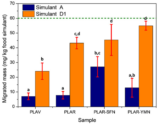 Overall migration studies were conducted in food simulants A and D1 and the results after 10 contact days are shown in Figure 4. Higher migrations levels were observed in simulant D1 with respect to the same material exposed to simulant A (p < 0.05). With increasing the ethanol concentration from 10% v/v in Simulant A to 50% v/v in Simulant D1, higher migration values were observed in all formulations (p < 0.05). It is known that sorption of certain organic solvents, including ethanol, causes swelling of the PLA matrix and creates voids enlarging the gaps between molecules in the polymer structure, resulting in an increase in the free volume that further promotes the diffusion of potential migrants (additives, low-molecular-weight compounds, etc.) from the polymer to the food simulant [43,44,45]. Higher migration levels were observed in the PLAR sample with respect to PLAV in Simulant D1 (p < 0.05), in which the highest amount of ethanol promotes a higher free volume increment. This could be explained by the degradation of PLA during recycling, which generates shorter polymer chains. Migration of these low-molecular-weight segments could be more easily promoted by ethanol, while more water molecules are able to diffuse into the polymeric matrix, accelerating the hydrolysis process. With regard to the nanocomposites, somewhat higher migration levels (p > 0.05) were observed, but it should be highlighted that all the materials presented migration levels lower than the legal overall migration limit of 60 mg/kg of food simulant [38].
