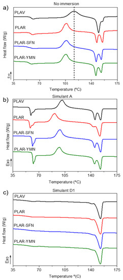 The degradation and subsequent migration of the degradation products to the food simulant are not the only effects of ethanolic solutions on PLA matrix. Previous studies, such as those conducted by Fortunati et al. [43], Arrieta et al. [32], and Iñiguez-Franco et al. [44,46], have reported an increase in the crystallinity degree of PLA-based materials after immersion in ethanolic solutions at different concentrations. The structural changes of the different samples after immersion were studied by means of DSC and FTIR spectroscopy. Figure 5 shows the DSC first heating scans before immersion (a) and after the immersion in simulant A (b) and simulant D1 (c). Table 2 summarizes the DSC results of the different samples.