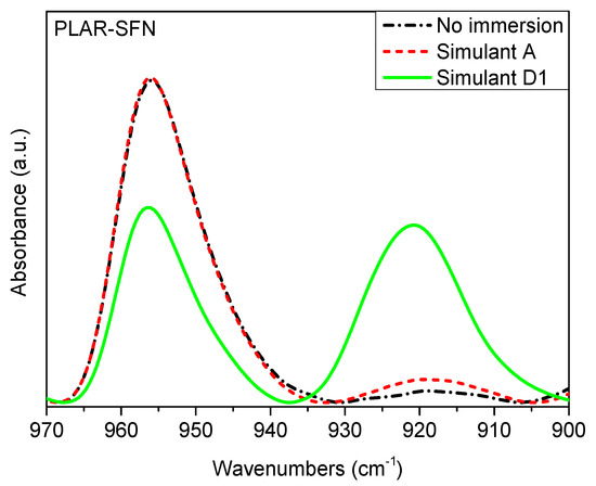 ATR-FTIR spectra of the recycled poly(lactic acid) and silk fibroin nanoparticle nanocomposite (PLAR–SFN) before and after immersion in the different food simulants. Region between 900 and 970 cm−1.