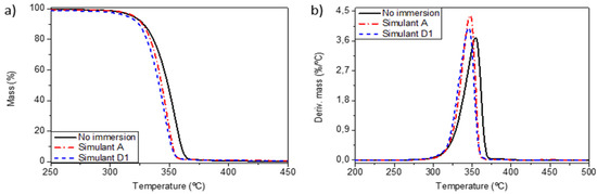 As has been discussed in the previous sections, the immersion of PLA in the different food simulants could cause important structural changes that can affect the properties of the materials. Thermal stability and hardness were measured, before and after immersion, by means of dynamic TGA and microhardness measurement tests, respectively. Figure 7 and Table 3 summarize the TGA results of the different samples.