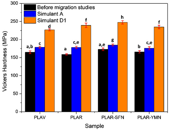 The mechanical properties of the samples could also be affected by the structural changes that take place during the immersion in the different food simulants. Figure 8 shows the Vickers hardness values of the different samples before and after the immersion in the different food simulants. The mechanical recycling process led to a slight, but not significant (p > 0.05), decrease in the hardness of PLA. This behavior has been reported in previous studies, and it is related to the degradation of the polymer during the accelerated aging, washing, and melt reprocessing [18,61]. However, the addition of both silk fibroin and yerba mate nanoparticles led to a significant increase (p < 0.05) in the hardness of recycled PLA. The reinforcing character of these nanoparticles has already been pointed out in previous studies [23,24].