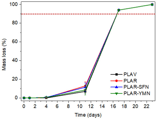 Figure 10 shows that, after 4 days of composting disintegration, all the samples increased their opacity. However, no significant changes were observed in the mass loss among film formulations after 4 days of composting disintegration. The disintegrability of PLA under composting conditions starts by a hydrolysis process and it is further followed by enzymatic actions of microorganisms [8,41]. The increased opacity of PLA indicates that the hydrolytic disintegration process has started, since the water absorption and the presence of products generated during the hydrolytic degradation produce changes in the refraction index of polymeric materials [68]. Although no significant mass losses were observed, the PLAV and PLAR samples exhibited a reduction in the molecular weight after 4 days, as can be seen from the intrinsic viscosity reduction of about 42% (Table 4). A smaller reduction in the molecular weight was observed in the nanocomposites (around 33%). This result suggests that nanoparticles protect the polymeric matrix from the degradation process, due to the above-described barrier effect, which restricts the water penetration and delays the disintegration process. A similar behavior has already been observed in previous works, and it has been ascribed to the nucleating effect of such nanoparticles on PLA matrix [26]. In fact, TGA results show that the reduction in T10 values after 4 days in composting was around 45 °C in neat PLA, between 27 °C and 29 °C in PLAR and PLAR–SFNs, and around 15 °C for PLAR–YMNs. This lesser reduction in the T10 values may be related to the antioxidant effect of YMNs provided by the high amount of total polyphenol content (TPC of YMNs = 41 ± 1 mg of gallic acid/g yerba mate nanoparticles [26]), making YMNs able to protect the polymeric matrix from thermal degradation. The large decrease in the thermal stability after only 4 days of degradation was probably due to the loss of low-molecular-mass compounds, which were generated by hydrolysis during the initial degradation stage.