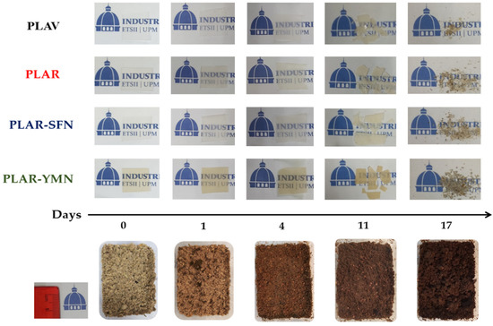 After 17 days under composting conditions, tiny pieces of polymeric samples were recovered (Figure 10) and all the formulations had lost more than 90% of their initial mass, which is frequently used as the goal of the disintegrability test [68,71]. After 23 days, the materials had completely disappeared, and the compost soil showed a pH around 7. Moreover, the compost soil’s color changed during the composting test, as is shown at the bottom of Figure 10, resulting in a dark humus soil as a consequence of the aerobic fermentation, confirming the success of the composting test.