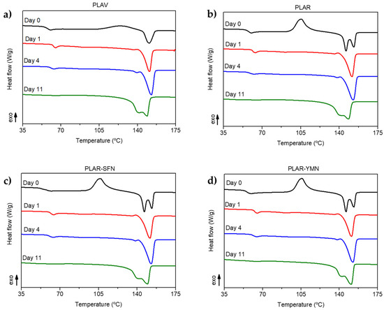 DSC first heating scan of (a) virgin PLA (PLAV), (b) recycled PLA (PLAR), (c) recycled PLA-silk fibroin nanoparticles nanocomposite PLAR-SFN, and (d) recycled PLA-yerba mate nanoparticles nanocomposite PLAR-YMN before and after different days of disintegration under composting conditions.