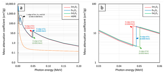 Additionally, Figure 1a,c,e reveal uncharacteristically sharp increases in µm values at photon energies of 0.006–0.008 MeV and 0.04–0.05 MeV for all rare-earth oxide/HDPE composites. These phenomena were observed due to the K-edge and L-edge absorptions of Sm, Eu, and Gd atoms (Figure 2), for which the incident photon energies were just above the binding energy of the electron shells inside the atoms, resulting in immensely enhanced interaction probabilities between the incident photons and the materials through photoelectric absorption at these particular energies [52].