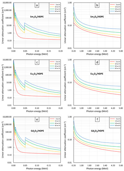 The following are available online at https://www.mdpi.com/article/10.3390/polym13121930/s1, Table S1: Mass attenuation coefficients (µm) of HDPE composites at photon energies of 0.001–5 MeV, Table S2: Mass attenuation coefficients (µm) of Sm2O3/HDPE composites at filler contents of 20, 40, and 60 wt.% and photon energies of 0.001–5 MeV, Table S3: Mass attenuation coefficients (µm) of Eu2O3/HDPE composites at filler contents of 20, 40, and 60 wt.% and photon energies of 0.001–5 MeV, Table S4: Mass attenuation coefficients (µm) of Gd2O3/HDPE composites at filler contents of 20, 40, and 60 wt.% and photon energies of 0.001–5 MeV, Table S5: Comparative µm, µ, and HVL values of Sm2O3/HDPE, Eu2O3/HDPE, and Gd2O3/HDPE composites with other common Pb-free HDPE composites (Bi2O3/HDPE, WO3/HDPE, and Fe2O3/HDPE) at filler contents of 20, 40, and 60 wt.% and photon energies of 0.1, 0.5, 1, and 5 MeV.