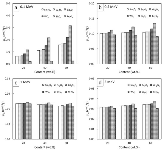 The µm values for the Sm2O3/HDPE, Eu2O3/HDPE, and Gd2O3/HDPE composites with filler contents of 0–60 wt.%, determined at the photon energies of 0.1, 0.5, 1, and 5 MeV, are shown in Figure 3, with strong linear correlations evidenced between the filler contents and the µm values at all investigated energies. In particular, as shown in Figure 3a,b,d, there were positive correlations between the µm values and filler contents, mainly due to the potent roles of the Sm2O3, Eu2O3, or Gd2O3 particles in photon attenuation through the dominant photoelectric absorption at 0.1 and 0.5 MeV and the pair production at 5 MeV (the two mechanisms were highly dependent on the Z value). This positive correlation implied that higher filler contents would result in more available rare-earth elements to interact with the incident photons, resulting in enhanced interaction probabilities and, consequently, improved shielding abilities. The schemes showing effects of radiation-protective fillers and their contents on photon attenuation can be viewed elsewhere [43,53].