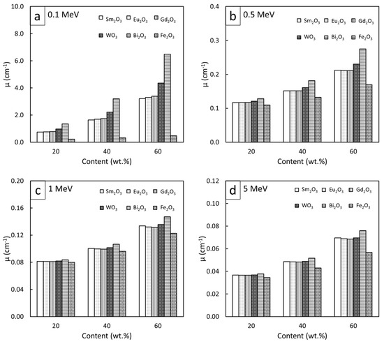 Comparative µm values of Sm2O3/HDPE, Eu2O3/HDPE, and Gd2O3/HDPE composites with other common Pb-free HDPE composites (Bi2O3/HDPE, WO3/HDPE, and Fe2O3/HDPE) at filler contents of 20, 40, and 60 wt.% and photon energies of (a) 0.1 MeV, (b) 0.5 MeV, (c) 1 MeV, and (d) 5 MeV.