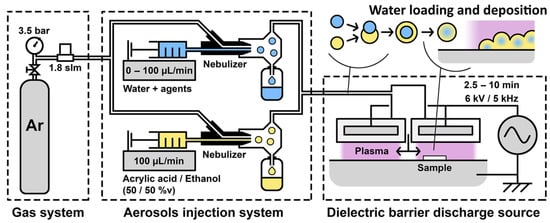 AA-APPD was performed with an AlmaPLUS reactor system (AlmaPlasma, Bologna, Italy). It consists of a gas system, a homemade aerosol injection system, and an open-air under-hood planar DBD source (Figure 1). The gas system was used to feed the aerosol injection system with a 1.8 standard liter per minute flow rate of Ar 99.999% (Messer Canada Inc., Mississauga, ON, Canada) by setting the pressure to 3.5 bar. The aerosol injection system consisted of two parallel nebulizers PEEK Mira Mist (Burgener, Mississauga, ON, Canada) allowing loading the Ar flow with a precursor aerosol and a water aerosol simultaneously. Nebulizers were fed by syringe pumps, which allowed controlling the aerosols flow rate. Both aerosols were mixed through 20 cm of gas line and a mixing chamber and then injected into the DBD. The DBD source consists of two high-tension electrodes placed above a grounded metallic table used as a sample holder. The inter-electrodes gap was set to 2 mm. High-tension electrodes are surrounded by 4.5 mm of dielectric high-density polyethylene. A 6 kV tension with a 5 kHz frequency was applied on the high-tension electrodes to produce the discharge. A 1 mm gap between the two high-tension electrodes was used to fill the DBD with the Ar flow loaded with the aerosols. AA-APPD was performed on cm2 clean substrates cut from (100)-oriented silicon wafers with a thickness of 280 µm. The effect of deposition time was studied between 2.5 min and 10 min (Table 1). A 50/50% v mixture of acrylic acid 99% (Sigma-Aldrich, Hamilton, ON, Canada) and ethanol anhydrous (Commercial Alcohols, Brampton, ON, Canada) was used as precursor solution. Ethanol addition is expected to increase water aerosol loading into the precursor aerosol [31,32,33]. Ultrapure water from a Purelab Flex (Elga Veolia, Woodridge, IL, USA) was used as a water solution. The precursor flow rate was fixed to 100 µL/min while the effect of the water flow rate was studied between 0 µL/min and 100 µL/min (Table 1).