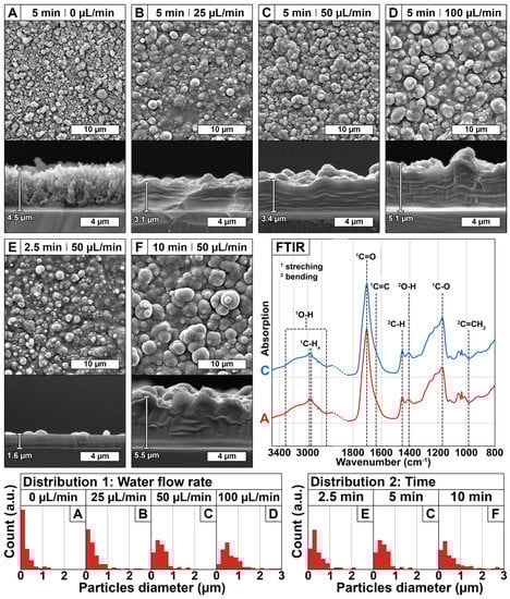 Scanning electron microscopy images of coatings surface morphology (×5000) and cross-section (×10,000) deposited with different water flow rate: 0 µL/min (A), 25 µL/min (B), 50 µL/min (C), and 100 µL/min (D); and for different time: 2.5 min (E), 5 min (C), and 10 min (F). Influence of plasma parameters, water flow (Distribution 1) and deposition time (Distribution 2), on the distribution of particles diameter, done on 200 particles. Fourier-transform infrared spectra of coatings chemistry deposited without water flow rate (FTIR, A, red spectrum), and with 50 µL/min water flow rate (FTIR, C, blue spectrum), and identification of major bonds signal.