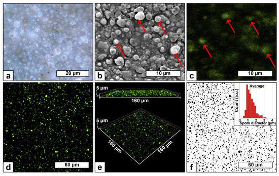 Characterization of different agents in coatings deposited with condition C (Water aerosol flow rate of 50 µL/min and deposition time of 5 min); bright field optical microscopy image (×100) of coating deposited with water loaded with 1 drop/mL of red colorant (a), scanning electron microscopy image of the surface morphology (×5000) (b) and corresponding energy-dispersive X-ray spectroscopy mapping of Cu (c) of coating deposited with water loaded with 1 mol/L of CuSO4, confocal microscopy image (×50, 428 nmex/536 nmem) (d) and corresponding three-dimensional representations (e) of coating deposited with water loaded with 0.5 mg/mL of Lucifer Yellow, LY, and binarized image of the fluorescent spots of the confocal microscopy image “d” (f) and extracted spots diameter distribution on 1603 spots (f, graph, top-right).
