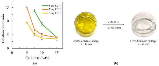 (a) Gelation time of cellulose dissolved in aqueous [C4mpyr][OH] (50 wt% water) solution as a function of cellulose concentration for different crosslinker (ECH) concentrations at 25 °C. (b) Example of a cellulose ionogel (left) and hydrogels (right) made by using 5% cellulose with their diameter (d).