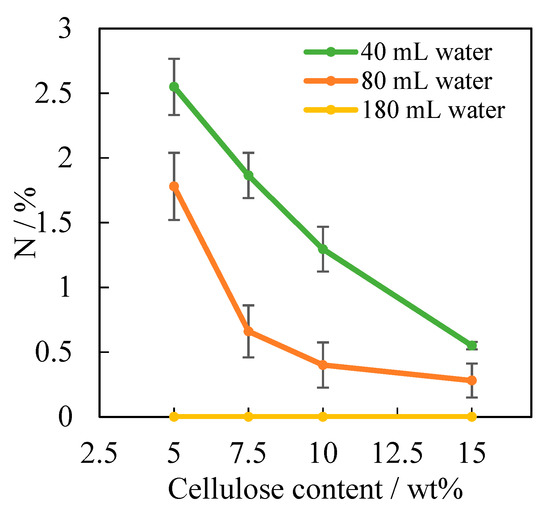 Nitrogen content of cellulose hydrogels swollen in 40, 80, or 180 mL of water for 24 h at 25 °C, and then dried to cryogels.