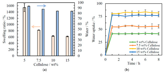 The swelling and re-swelling behavior of the cellulose gels in water at 25 °C was investigated as a function of the cellulose concentration. In Figure 3a, on the left vertical axis, the swelling ratio is plotted against the cellulose concentration. For all the gels, 24 h swelling in water represents the state of equilibrium. The cellulose concentration strongly influences the swelling behavior. A higher cellulose concentration resulted in less swelling, confirming the results from the literature [45]. With increasing cellulose concentration, the physical cross-linking of the polymer chain increases by hydrogen bonding and chain entanglements which lead to a more stable system and a decrease in swelling ratio. However, it is noticeable that the gels with a cellulose concentration of 15 wt% did not follow this trend. The difference between the swelling ratio of 10 and 15 wt% cellulose gels was only 7%. It is conceivable that an equilibrium of physical cross-linking already occurred at 10 wt%. Therefore, increasing the cellulose concentration had no major effect on the swelling behavior. Overall, all the gels showed high swelling in water.