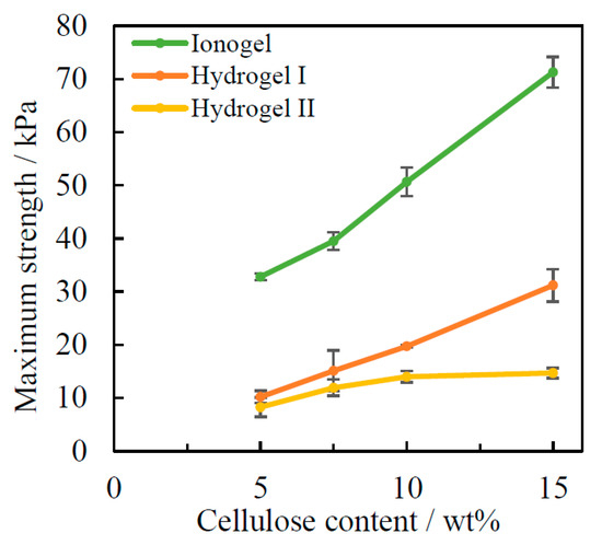 The maximum compressive strength of the ionogels and hydrogels with varying cellulose concentrations is shown in Figure 4. The maximum compressive strength, also called ultimate strength, is the maximum stress that a material can withstand while remaining in the elastic (reversible) deformation range. First, the stress–strain curves of each gel were measured (Figures S3–S5). At the point where the gels started to break, a sudden decrease in stress was observed, followed by an increase in stress until the next breaking. The point right before the first breaking was chosen as the limit of the stress–strain curves and as the maximum strength (Figure 4). The compressive stress of the cellulose gels increased with increasing cellulose concentration (Figure 4). This result confirms the findings known from the literature that higher biopolymer concentration leads to an increase in compressive stress [46]. Furthermore, the ionogels showed higher compressive resistance than the hydrogels. It is conceivable that the cation and anion of [C4mpyr][OH] are building hydrogen bonds when dissolving cellulose which led to an increase in stability. The hydrogels also contained a large amount of water (Figure 3) which led to more flexibility and elasticity but also to lower overall stability, i.e., compressive strength.