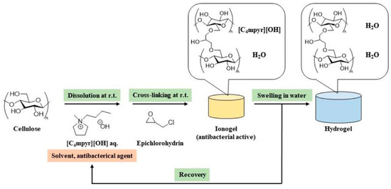 Due to the numerous possible applications for cellulose hydrogels, it is necessary to develop environmentally friendly, simple, efficient, and cost-effective technologies for the preparation of cellulose gels. In this study, we concentrated on a simple, fast, and environmentally benign procedure for preparing cellulose gels by employing unsubstituted cellulose. In previous studies, we found that N-butyl-N-methylpyrrolidinium hydroxide in an aqueous solution ([C4mpyr][OH] aq.) enables the dissolution of up to 20 wt% cellulose within a short time at room temperature [38]. Since no heating or cooling conditions are required, energy consumption for dissolution is low, making it a more environmentally benign solvent for cellulose processing. The co-solvent water is also an abundant, non-toxic compound which makes the dissolution process even more cost-efficient and environmentally friendly. ECH was chosen as the crosslinker because it is a highly reactive etherifying agent that can cross-link the hydroxide groups of cellulose under alkaline conditions without catalysis, even at low temperatures [24,25]. After developing a simple one-pot preparation method for unmodified cellulose gels by employing [C4mpyr][OH] in aqueous solution and ECH, the swelling ratio, water uptake, mechanical properties under compression as well as the antibacterial activity of the cellulose gels were investigated. In this study, the antibacterial property of gels with and without [C4mpyr][OH] was investigated by using the disk-diffusion test to evaluate possible applications of the gels as a biomedical material. The disk diffusion method is a common evaluation method for antimicrobial activity, where the microbial growth inhibition is expressed as a diameter [39,40]. Furthermore, attempts were made to recover the solvent [C4mpyr][OH] in aqueous solution in order to enable an environmentally friendly recycling process. The concept of this research is summarized in Scheme 1.