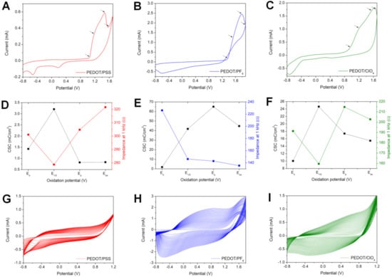 As demonstrated in several previous studies [19], by choosing a doping agent, it is possible to affect the polymerization potential of the monomer, the efficiency of polymer formation, and its electrochemical characteristics. On that account, for each investigated system, the polymerization potential ranges were optimized separately. In all cases, the starting potential was chosen as −0.8 V (vs. Ag/AgCl), which was associated with the lower limit of a water window for a bare platinum electrode. The oxidative potentials were selected based on the position of a polymerization peak (anodic peak responsible for irreversible oxidation of the monomer [20]) and its vicinity: onset potential (Eo), the half-peak potential (E1/2), the peak potential (Ep), and the overoxidation potential (Eoo), all approximated to ±0.1 V (Figure 1A–C). Upper potential limits for the polymerization of EDOT were optimized in terms of best electrical performance expressed by high CSC and low impedance at 1 kHz (Figure 1D–F). Eventually, the anodic potentials of 1.8 V, 1.2 V, and 1.2 V were chosen for nBu4NPF6/ACN, LiClO4/H2O, and NaPSS/H2O, respectively, and the corresponding polymerization curves of EDOT were plotted in Figure 1G–I.