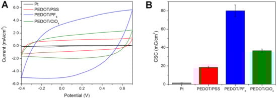 Cyclic voltammetric characterization of PEDOT matrices. (A) CV curves collected in 0.1 M KCl at a scan rate of 100 mV/s; (B) Comparison of CSC values calculated from the CV data for a bare platinum electrode as well as the electrodes coated with PEDOT/PSS, PEDOT/PF6, and PEDOT/ClO4; n = 3.