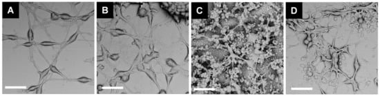 The cytotoxicity of reported materials was determined based on the ability of viable cells to reduce tetrazolium dye MTT (3-[4,5-dimethylthiazol-2-yl]- 2,5-diphenyltetrazolium bromide) to insoluble formazan. Consequently, 50 µL of MTT solution (0.05 mg/mL in phenol red and FBS free DMEM-F12; PAA) was added to samples collected from 12-well plates. After 1–2 h in a CO2 incubator, MTT solution was removed and the resulting formazan crystals were dissolved in 400 µL acidic isopropanol. Absorbance measurements at 570 nm were performed using a multi-well plate reader SYNERGY4 (BioTek Instruments, New York, NY, USA).