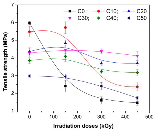 At the irradiation dose of 150 kGy, the cross-linking reaction—potentially unfinished in the NR/PS curing with peroxide—is continued. The statement is supported by the initial tendency of tensile strength to increase at this irradiation dose, especially of NR and C10 samples and by the results obtained in gel fraction and cross-link density analysis. More than that, the small amount of PS in C10 made that its behavior to be closer to that of NR compared to that of the other samples (C20–C50).